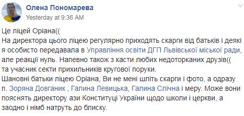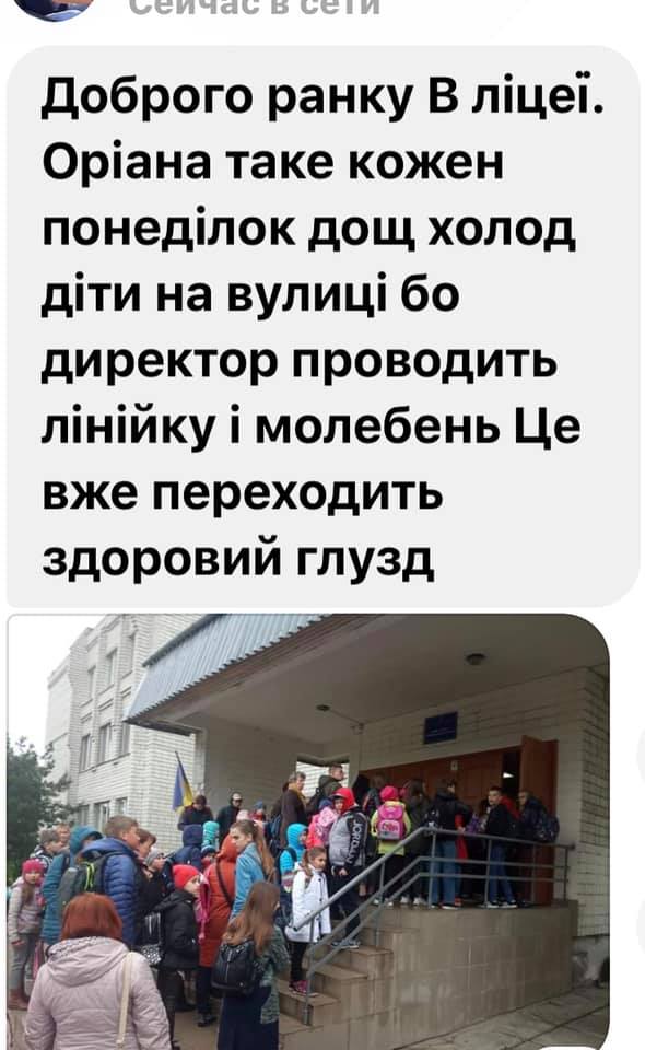 На такие принудительные молебны по понедельникам детей заставляет выходить директор лицея Сватко Юрий Иванович. Елена Пономарева пишет, что она и другие родители неоднократно жаловались в Управление образования Львовского городского совета, но там не реагируют на обращения.