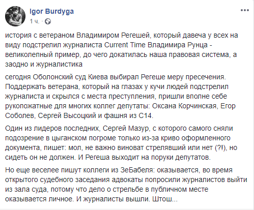 Бурдыга отметил, что поддержать в суде подстрелившего журналиста ветерана АТО пришли ультраправые и народные депутаты. Журналист также обратил внимание на то, что один из лидеров С14 Сергей Мазур заявил: "неважно, виноват стрелявший или нет, но сидеть он не должен".
