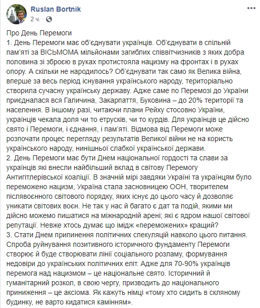 "О Дне Победы. 1. День Победы должен объединять украинцев. Объединять в общей памяти о восьми миллионах погибших соотечественников, из которых добрая половина с оружием в руках противостояла нацизму на фронтах и в движениях сопротивления. А сколько не родились? Объединять так же, как Великая война, впервые за весь период существования украинского народа, территориально создала современное украинское государство. Ведь именно после Победы к Украине присоединилась вся Галичина, Закарпатье, Буковина - до 20% территории и населения. В противном случае, читая планы Рейха в отношении Украины, украинцев ждала судьба или этрусков, то курдов. Для украинцев это действительно праздник и Победы, и единения, и памяти. Отказ от Победы может начать процесс пересмотра результатов Великой войны не в интересах украинского народа, нынешнего слабого украинского государства.