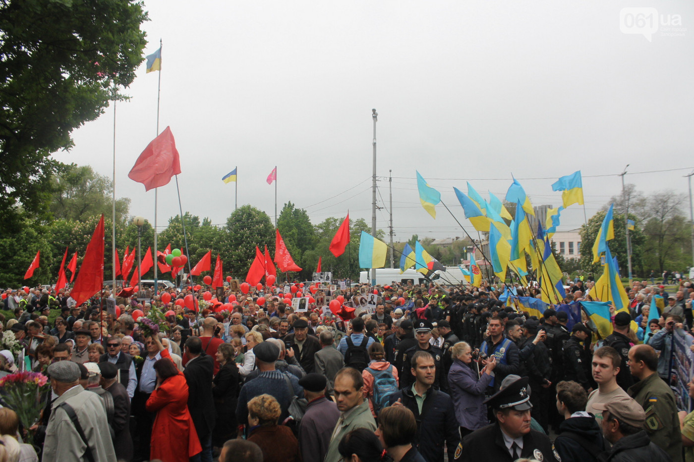 Представители "Полка Победы" заявляли, что добьются возвращения имен советских военачальников декоммунизированным улицам Запорожья и не допустят "переписывания истории страны". В свою очередь проукраинские активисты в ходе своего митинга отметили, что преклонятся перед памятью воинов Второй мировой войны, погибших "хоть за советскую, но за Украину". Также запорожские историки рассказывали собравшимся историческую правду о той войне.