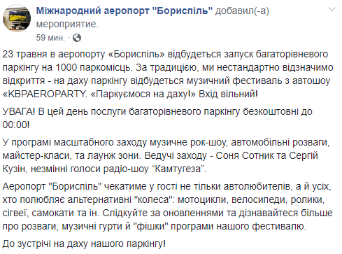 "Аэропорт "Борисполь" будет ждать в гости не только автолюбителей, но и всех, кто любит альтернативные "колеса": мотоциклы, велосипеды, ролики, сигвеи, самокаты и др. Следите за обновлениями и узнавайте больше о развлечениях, музыкальные группы и "фишки" программы нашего фестиваля", - говорится в сообщении.