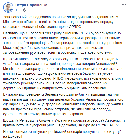 "Обеспокоен неожиданной новостью по итогам заседания ТКГ в Минске о якобы готовности Украины в одностороннем порядке отменить экономические ограничения для ОРДЛО", – написал Порошенко.