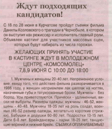 Главные условия для женщин - отсутствие татуированных бровей и накачанных губ, гель-лака на ногтях, у мужчин - отсутствие бороды. То есть внешний вид должен соответствовать образу людей в СССР середины 80-х, когда и произошла трагедия. Сами съемки намечены на 18-28 июня этого года.
