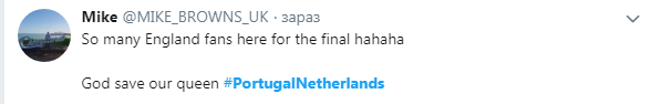 21:24 Mike сообщает, что на финальный матч в Порту приехали многочисленные английские болельщики. Их команда в полуфинале проиграла Нидерландам 3:1, но сегодня реабилитировалась - выиграв бронзу у сборной Швейцарии по пенальти.