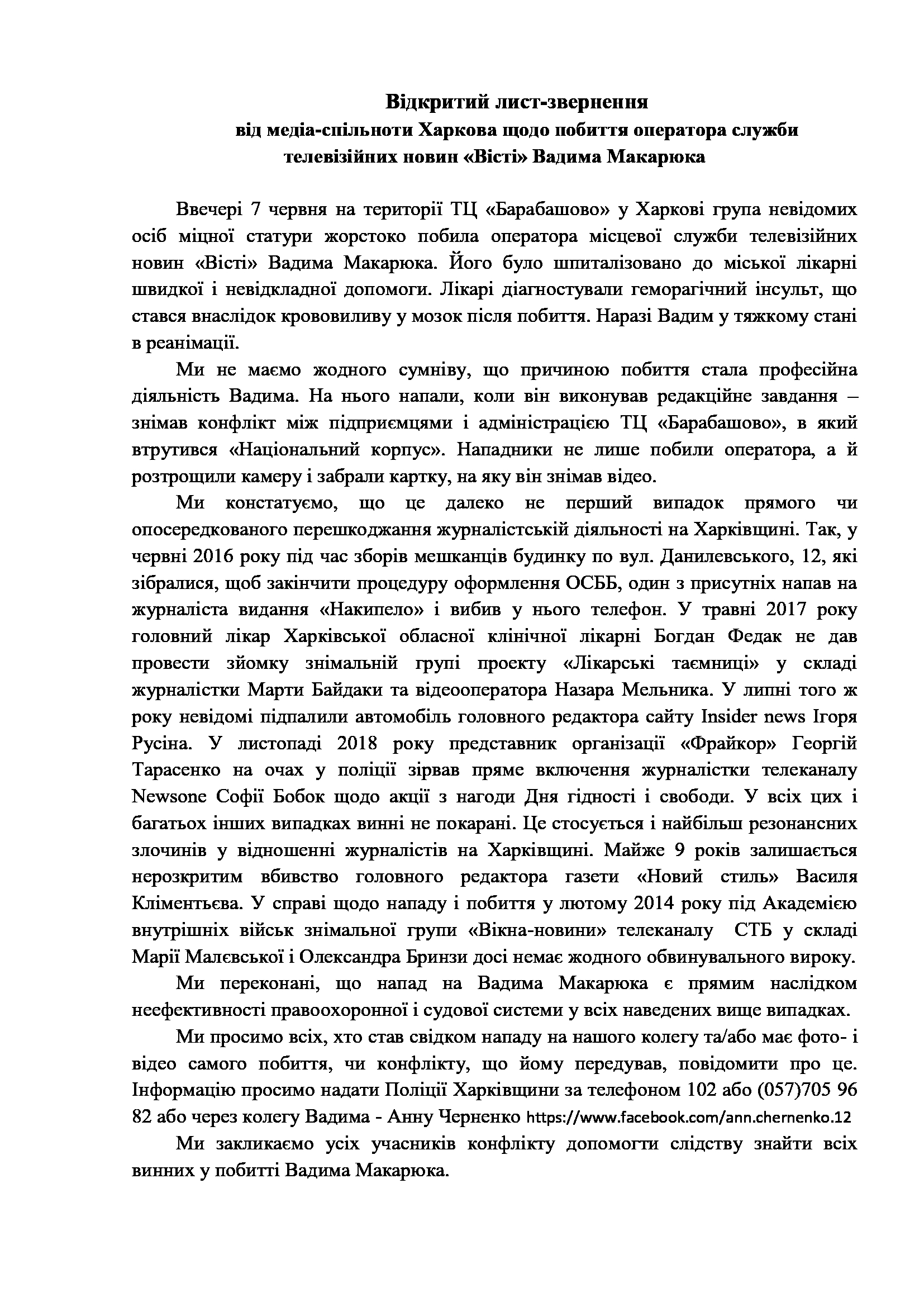 "Во всех этих и многих других случаях виновные не наказаны. Это касается и самых резонансных преступлений в отношении журналистов на Харьковщине. Почти 9 лет остается нераскрытым убийство главного редактора газеты "Новый стиль" Василия Климентьева. В деле о нападении и избиении в феврале 2014 под Академией внутренних войск съемочной группы "Викна-новости" телеканала СТБ в составе Марии Малевской и Александра Брынзы до сих пор нет ни одного обвинительного приговора. Мы убеждены, что нападение на Вадима Макарюка является прямым следствием неэффективности правоохранительной и судебной системы во всех приведенных выше случаях", - говорится в обращении.