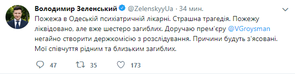 "Пожар в Одесской психиатрической больнице. Страшная трагедия. Пожар ликвидирован, но уже шестеро погибших. Поручаю премьеру Владимиру Гройсману немедленно создать госкомиссию по расследованию. Причины будут выяснены. Мои соболезнования родным и близким погибших", - написал он.