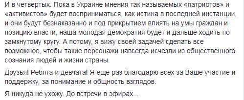 И, в-четвертых, Спивак считает, что "пока в Украине мнения так называемых "патриотов" и "активистов" будет восприниматься, как истина в последней инстанции, и они будут безнаказанно и под прикрытием влиять на умы граждан и позицию власти, наша молодая демократия будет и дальше ходить по замкнутому кругу". "А потому, я вижу своей задачей сделать все возможное, чтобы такие персонажи навсегда исчезли из общественного сознания людей и жизни страны", - подчеркнул Спивак.