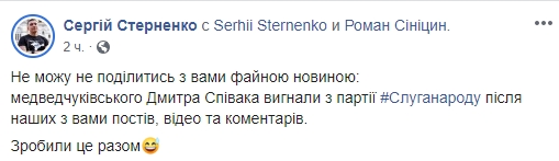 Активист Стерненко, убивший человека в мае 2018 года, уже обрадовался этому: "Не могу не поделиться с вами классной новостью: медведчуковского Дмитрия Спивака выгнали из партии # Слуганароду после наших с вами постов, видео и комментариев. Сделали это вместе".