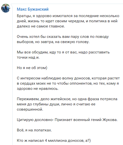 Из слов Стерненко следует, что еще один объект для атаки - днепропетровский блогер Макс Бужанский. Он известен своей позицией неприятия Евромайдана, а также активно дискутирует с националистами по поводу роли СССР во Второй Мировой войне. И он идет по мажоритарке от партии Зеленского.