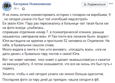 "Ее звали Юля. Пару раз пересекались в больнице - вот такая была как на фото всегда - улыбалась... Сгоревшее отделение №7 в психиатрической клинике раньше называлось "Ветеранов ВОВ". И Там почти все лежачие были - возраст... Юля вытащила на одеялах и простынях 52 человека из отделения. На себе, в буквальном смысле слова", - написала Екатерина Ножевникова.