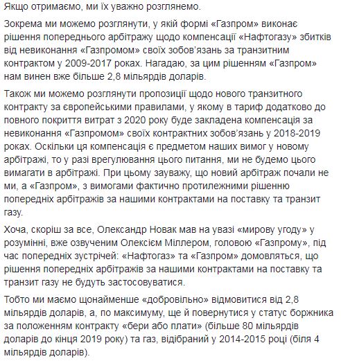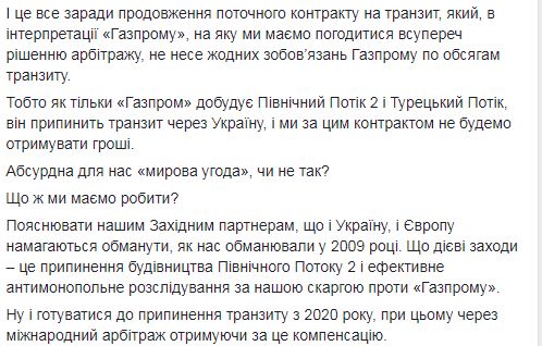 "И это все ради продолжения текущего контракта на транзит, на который, в интерпретации "Газпрома", мы согласимся вопреки решению арбитража и без как-либо обязательств со стороны "Газпрома" по объемам транзита. То есть, как только "Газпром" достроит "Северный поток-2" и "Турецкий поток", он прекратит транзит через Украину, и мы по этому контракту не станем получать деньги. Абсурдное для нас "мировое соглашение", не так ли?" - добавил Витренко.