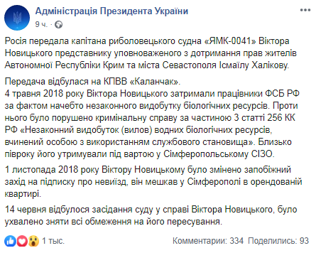 "Россия передала капитана рыболовного судна "ЯМК-0041" Виктора Новицкого представителю уполномоченного по соблюдению прав жителей Автономной Республики Крым и города Севастополя Исмаилу Халикову", - сказано в сообщении.