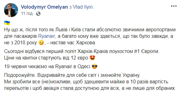 19 июня ждем Ryanair в Одессе. Путешествуйте. Открывайте для себя мир и меняйте Украину. Мы сделали все (не)возможное, чтобы удешевить почти в 10 раз стоимость перелетов и чтобы авиация стала доступной для всех, а не только для избранных", - написал министр.