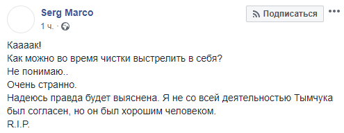 "Я до конца не верю в историю с Тымчуком. Опытный офицер отлично знает технику безопасности при чистке оружия" . - пишет журналист Денис Попович.