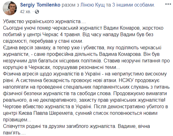 "Сегодня ночью умер черкасский журналист Вадим Комаров, жестоко избитый в центре Черкасс 4 мая. С момента нападения Вадим был без сознания, находился в состоянии комы. Единственная версия покушения, а теперь уже и убийства, которую разделяют черкасские журналисты - именно профессиональная деятельность Вадима Комарова. Он был неудобным для многих местных политиков. Ставил неудобные вопросы о коррупции в Черкассах, поднимал резонансные темы...