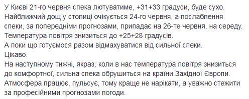 В Киеве 21-го июня жара также будет свирепствовать, ожидается сухая погода, днем +31.. + 33 градуса.