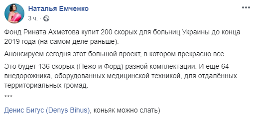 При этом, похоже, ее опередил президент, который сказал об этом на сегодняшней встрече с бизнесменами. Наталья Емченко в посте отметила журналиста Дениса Бигуса, который раньше пообещал коньяк тому, кто первым раскроет информацию о меценате, который купил скорые, но Зеленский не назвал его.