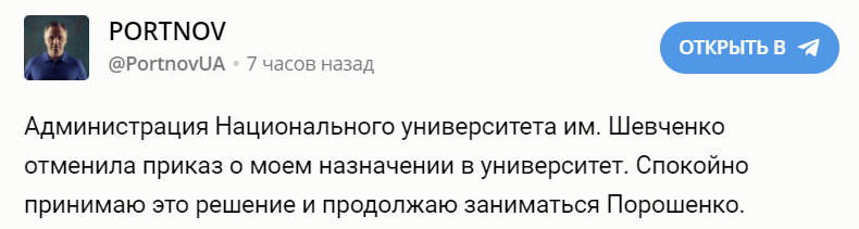 "Администрация Национального университета им. Шевченко отменила приказ о моем назначении в университет. Спокойно принимаю это решение и продолжаю заниматься Порошенко", - заявил Портнов.