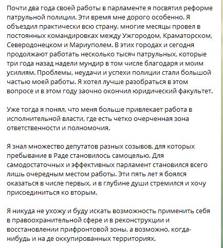 Найем отметил, что никуда не уходит и "будет искать возможность применить себя в правоохранительной сфере и в реконструкции и восстановлении прифронтовой зоны, а возможно, когда-нибудь и на деоккупированных территориях".