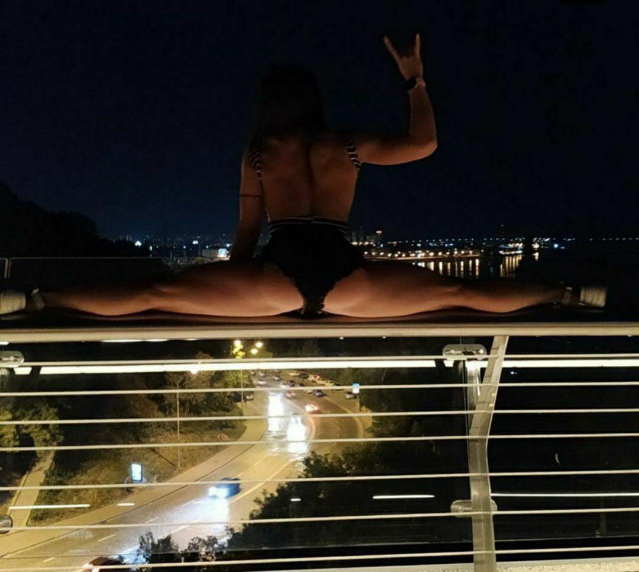 В Киеве появилась экстремальная конкурентка Волочковой, которая сделала шпагат на перилах стеклянного моста. Фото