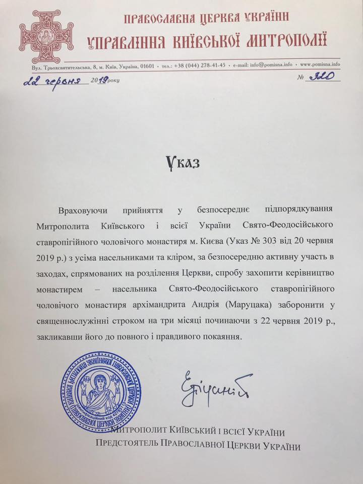 В указе за подписью главы ПЦУ Епифания говорится, что насельник Свято-Феодосийского ставропигиального мужского монастыря архимандрита Андрей (Маруцак) запрещен в священнослужении сроком на 3 месяца, начиная с 22 июня.
