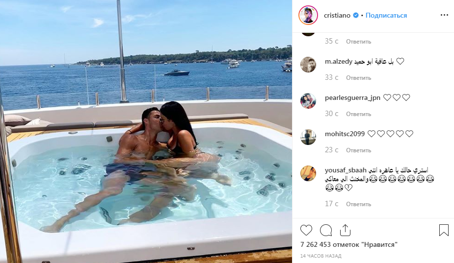 Футболист в своем Instagram выложил фото, где он страстно целуется с Джорджиной на греческом острове.