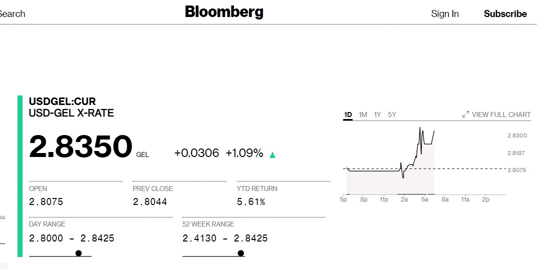 Грузинская валюта установила рекорд падения, обесценившись по отношению к доллару США на 1,1% - до 2,8250 лари/$1. Динамику падения отобразил сайт Bloomberg.
