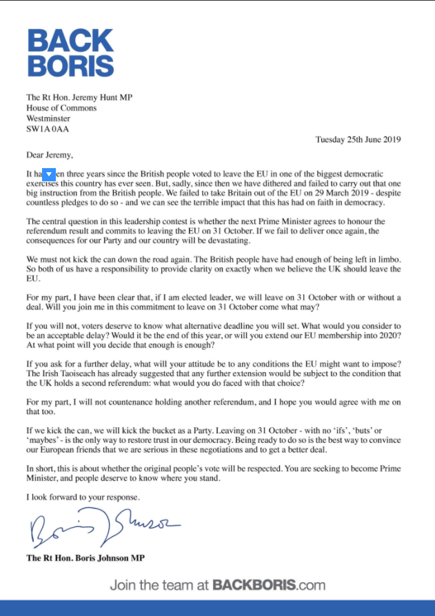 За пост лидера Консервативной партии Великобритании и, соответственно, за пост премьер-министра страны в настоящее время борются Хант и Джонсон, обошедшие восемь других претендентов. Джонсон с большим отрывом выиграл все раунды голосования в парламенте в рамках борьбы за эту должность.