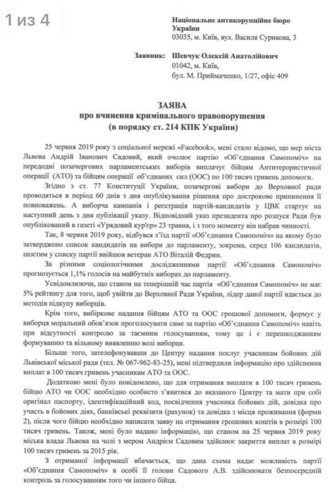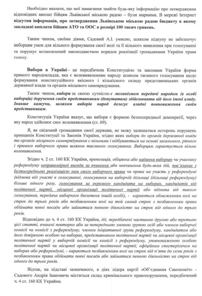 Шевчук требует принять заявление о преступлении Садового по четвертому пункту стати 160 (подкуп избирателя). В качестве доказательства адвокат приводит рекламу группе "Прихильники Самопомочі" в Facebook.