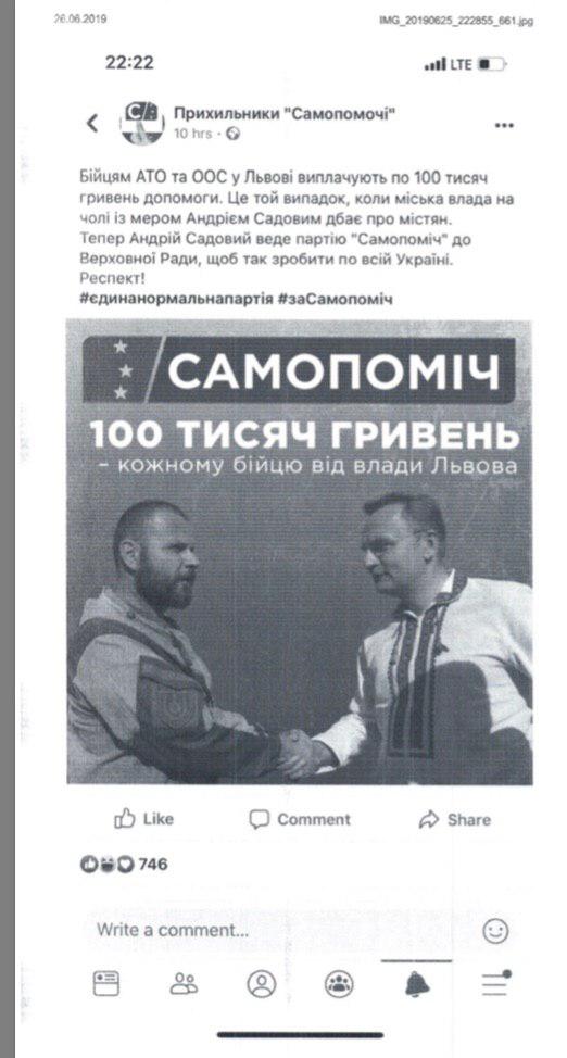 "Бойцам АТО и ООС во Львове выплачивают по 100 тысяч гривен помощи. Это тот случай, когда городская власть во главе с мэром Андреем Садовым заботится о горожанах. Теперь Андрей Садовой ведет партию "Самопомощь" в Верховную Раду, чтобы так сделать по всей Украине", - говорится в посте, иллюстрацией к которому служит фото, на котором мэр Львова жмет руку человеку в форме цвета хаки.