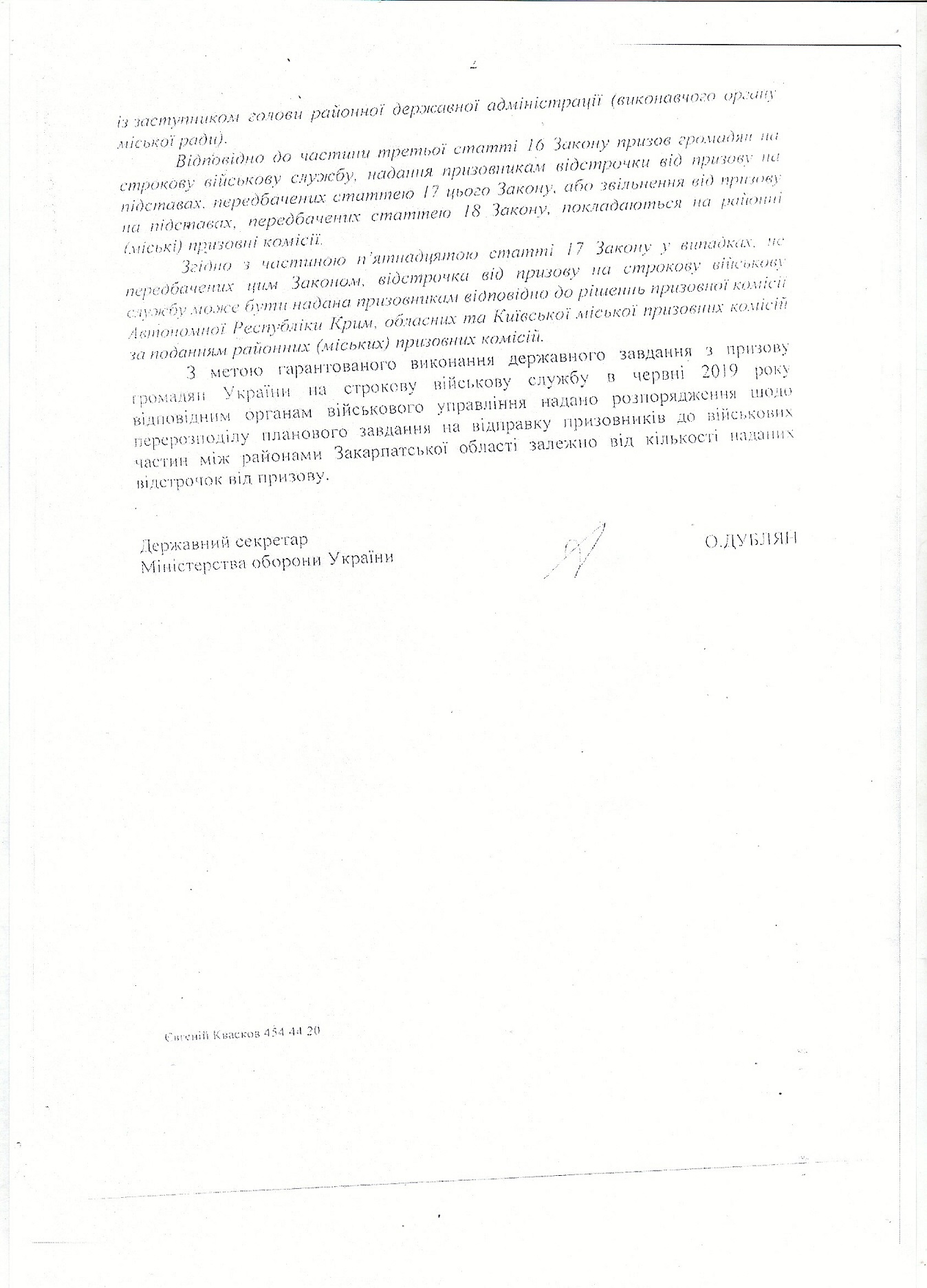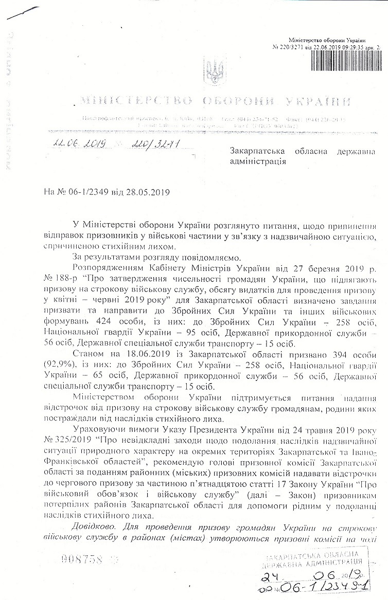 "Министерством обороны Украины поддерживается вопрос предоставления отсрочек от призыва на срочную службу гражданам, семьи которых пострадали от последствий стихийного бедствия. Учитывая требования Указа Президента Украины от 24 мая 2019 № 325/2019 "О неотложных мерах по преодолению последствий чрезвычайной ситуации природного характера на отдельных территориях Закарпатской и Ивано-Франковской областей", рекомендую главе призывной комиссии Закарпатской области по представлению районных (городских) призывных комиссий предоставлять отсрочки до очередного призыва по части пятнадцатой статьи 17 Закона Украины "О воинской обязанности и военной службе" призывникам пострадавших районов Закарпатской области для помощи родным в преодолении последствий стихийного бедствия", - указывается в тексте документа.