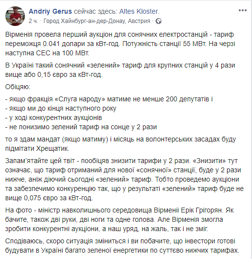 Как отметил Герус, данный тариф в Украине в четыре раза выше, чем в Армении, в которой состоялся первый аукцион для солнечных электростанций.