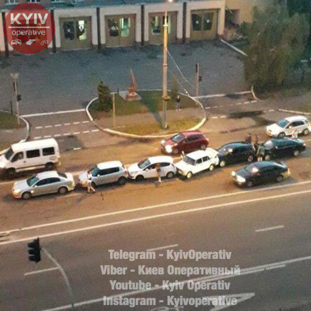 В пятницу, 28 июня, в Киеве "паровозиком" столкнулось сразу шесть автомобилей. Соответствующее фото опубликовал Telegram-канал Киев Оперативный.