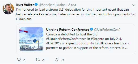 Во время конференции по поддержке реформ в Украине, которая состоится на следующей неделе в Канаде, будет присутствовать делегация США во главе со спецпредставителем Госдепа по Украине Куртом Волкером. Об этом он сообщил на своей странице в Твиттере.