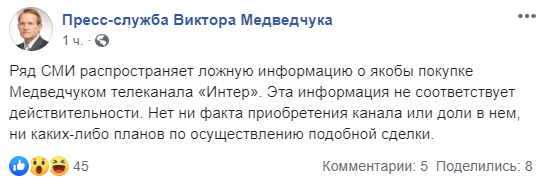 "Ряд СМИ распространяет ложную информацию о якобы покупке Медведчуком телеканала "Интер". Эта информация не соответствует действительности. Нет ни факта приобретения канала или доли в нем, ни каких-либо планов по осуществлению подобной сделки", – сказано в сообщении.