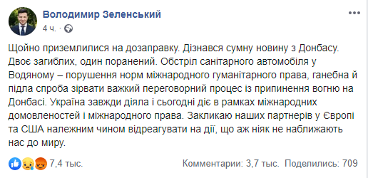 Глава Украины Владимир Зеленский заявил, что обстрел санитарного автомобиля в районе Водяного является "позорной и подлой попыткой" сорвать тяжелый переговорный процесс по урегулированию конфликта на Донбассе. Об этом он написал на своей странице в Facebook.