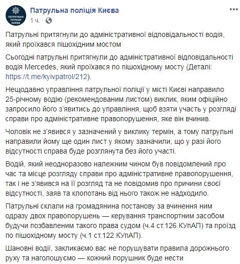 Водителю Mercedes выписали постановление за совершение админнарушения после проезда по пешеходному мосту в Киеве. Об этом сообщает пресс-центр патрульной полиции в Facebook.