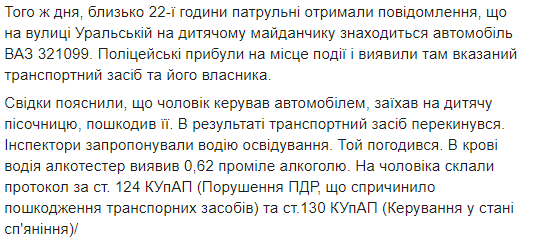 На мужчину составили протокол по ст. 124 КУоАП (Нарушение ПДД, повлекшее повреждение транспортных средств) и ст.130 КУоАП (Управление в состоянии опьянения), - сказано в сообщении. Только за минувшие выходные патрульные составили на водителей Днепра 59 протоколов за управление в состоянии опьянения.