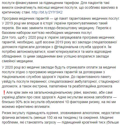 По ее данным, уже много лет инсульт на втором месте среди причин инвалидности и смертности как в мире, так и в Украине. Супрун также пишет, что с 2020 года в Украине начнут создавать современные инсультные центры по евростандартам, если осенью все учреждения специализированной помощи подпишут договор с Национальной службой здоровья.