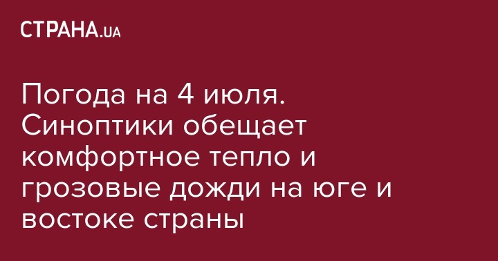 На западе страны днем +24, а ночью минимум +11. На севере несколько прохладнее, синоптики прогнозируют температуру воздуха днем до +22, а ночью около +10. В восточной Украине местами пройдут дожди. В целом в регионе будет наблюдаться солнечная погода с температурой воздуха днем от +26 до +28, ночью +16…+18. Весь южный регион 4 июля накроют грозовые дожди с молнией и сильным ветром. Днем столбик термометра покажет максимум +29, а вечером +19. В центре дожди не прогнозируются. Днем от 24 до 26 градусов выше нуля, а ночью около +13.
