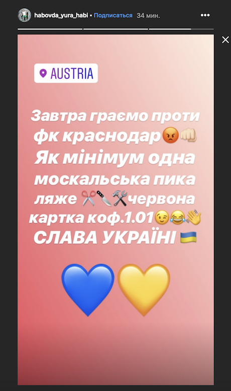 В Инстаграме украинского футболиста Юрия Габовды, выступающего за венгерский клуб "Халадаш", перед матчем с российским "Краснодаром-2" появилась "история", в которой говорилось, что "минимум одна москальская рожа ляжет". Об этом сообщает Tribuna.com.