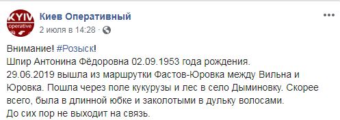 "Антонина Фёдоровна 02.09.1953 года рождения. 29.06.2019 вышла из маршрутки Фастов-Юровка между Вильна и Юровка. Пошла через поле кукурузы и лес в село Дыминовку. Скорее всего, была в длинной юбке и заколотыми в дульку волосами. До сих пор не выходит на связь", – говорится в посте.