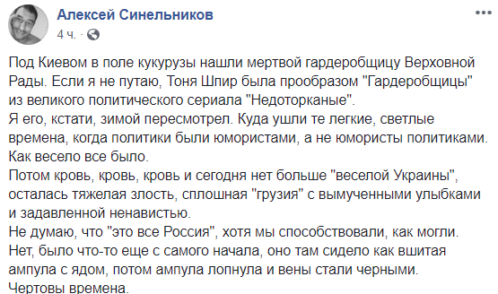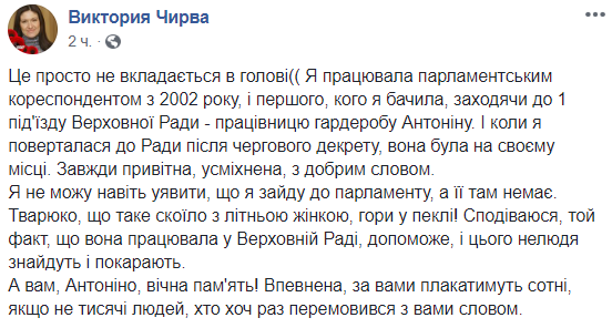 "Это просто не укладывается в голове. Я работала парламентским корреспондентом с 2002 года, и первого, кого я видела, заходя в 1 подъезд Верховной Рады, – работницу гардероба Антонину. И когда я возвращалась в Раду после очередного декрета, она была на своем месте. Всегда приветливая, улыбающаяся, с добрым словом.