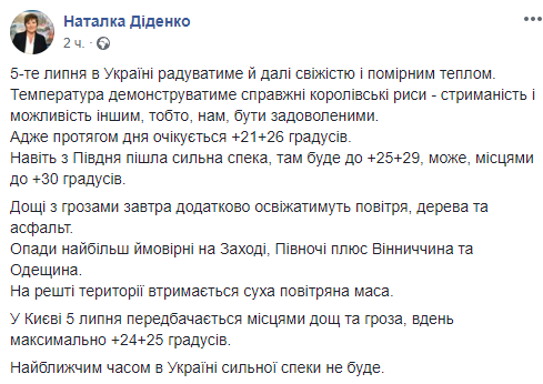 Пятница, 5 июля порадует украинцев свежестью и умеренным теплом. И даже в ближайшие дни в Украине не будет сильной жары. Об этом на своей странице в соцсети написала синоптик Наталья Диденко.