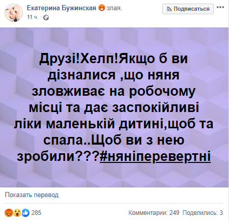 "Друзья! Хелп! Если бы вы узнали, что няня злоупотребляет на рабочем месте и дает успокаивающие лекарства маленькому ребенку, чтобы он спал… Что бы вы с ней сделали?", - обратилась она к своим подписчикам.