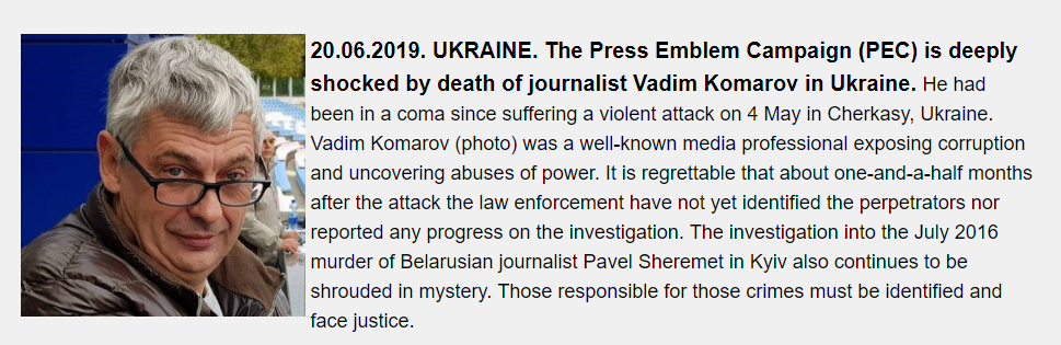 С января по конец июня этого года в 20 странах мира были убиты 38 журналистов. В списке погибших журналистов есть украинец Вадим Комаров, который умер 20 июня в Черкассах. Об этом говорится в отчете неправительственной компании Press Emblem Campaign, которая базируется в Женеве.