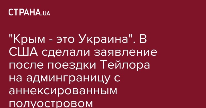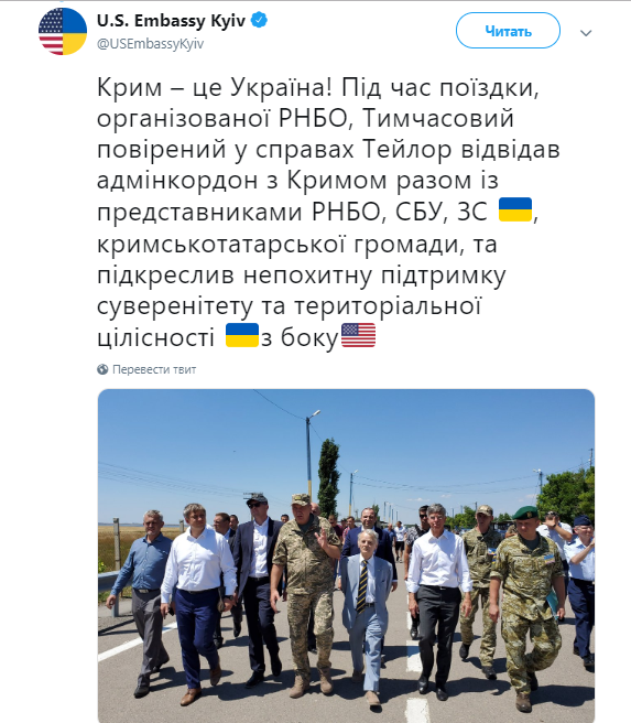 "Крым - это Украина! Во время поездки, организованной СНБО, временный поверенный в делах Тейлор посетил админграницу с Крымом вместе с представителями СНБО, СБУ, ВC Украины, крымскотатарской общины, и подчеркнул непоколебимую поддержку суверенитета и территориальной целостности Украины со стороны США", - говорится в заявлении.
