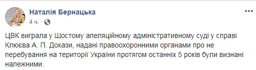 "ЦИК выиграла в Шестом апелляционном административном суде по делу Клюева А. П. Доказательства, предоставленные правоохранительными органами о не пребывании на территории Украины в течение последних 5 лет были признаны надлежащими", - сообщила она.