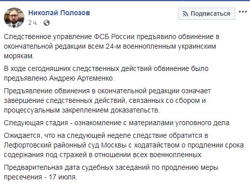 Координатор команды украинских моряков адвокатов Николай Полозов сообщил, что обвинение в окончательной редакции предъявлено следствием СУ ФСБ России всем 24 захваченным украинским морякам. Об этом адвокат написал в Facebook.