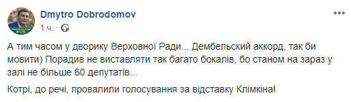 "А тем временем во дворике Верховной Рады... Дембельский аккорд, так сказать) Посоветовал не выставлять так много бокалов, потому что по состоянию на сейчас в зале не более 60 депутатов... Которые, кстати, провалили голосование за отставку Климкина!", - написал Добродомов.